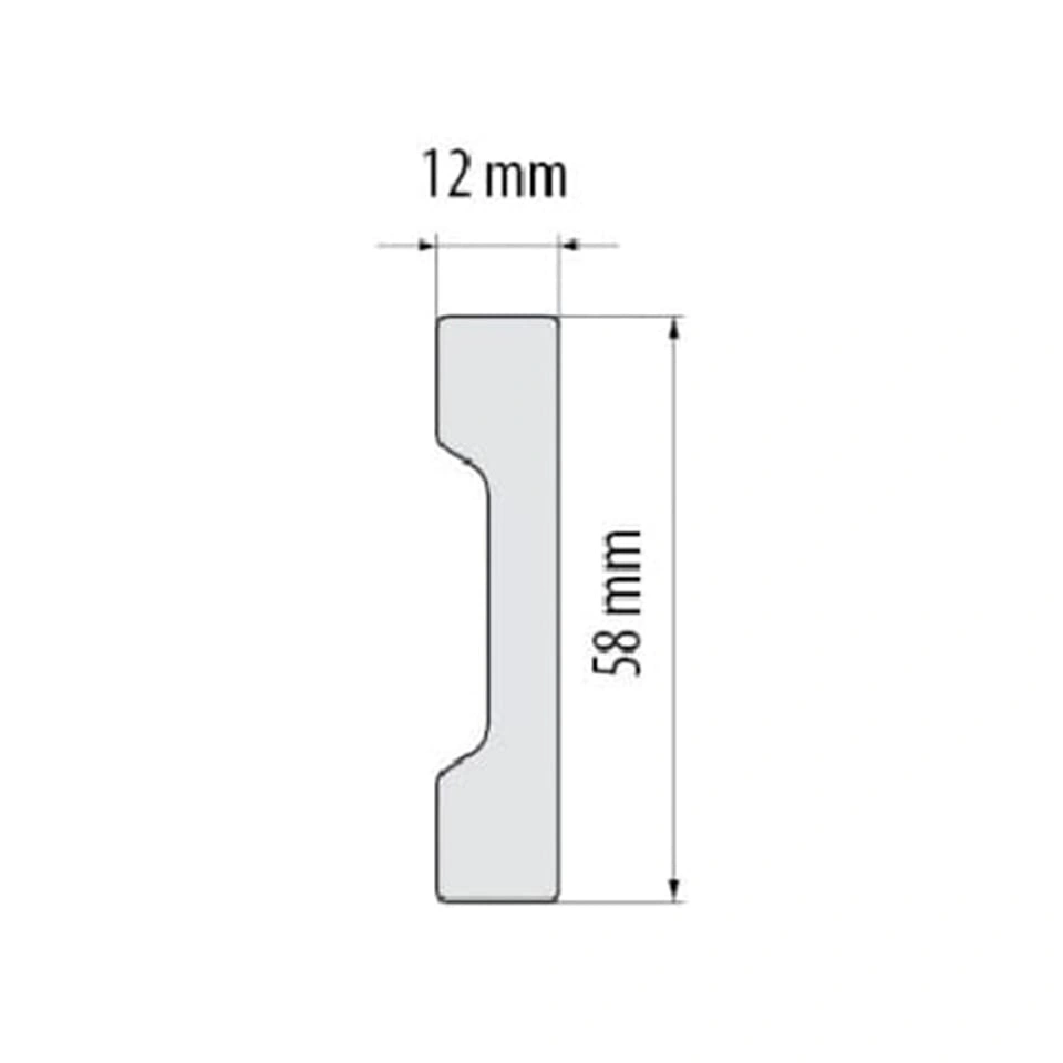 Are dimensiunile 58 mm latime, 12 mm grosime si 2000 mm lungime, ceea ce il face perfect echilibrat vizual – suficient de lat pentru a fi vizibil, dar destul de subtire pentru a ramane elegant.